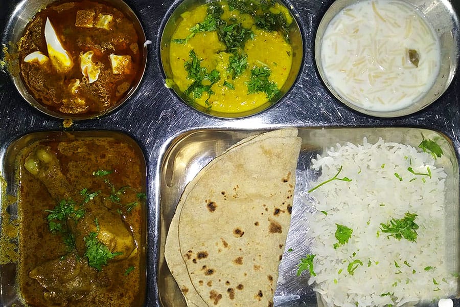 Lunch: 1 Seasonal Veg, 1 Dal, Rice, Raita, Chapati, Papad, Salad, Pickle